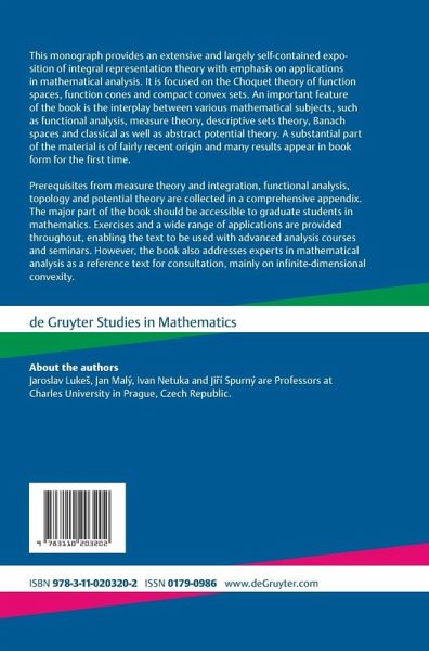 This monograph presents the state of the art of convexity, with an emphasis to integral representation. The exposition is focused on Choquet's theory of function spaces with a link to compact convex sets. An important feature of the book is an interplay between various mathematical subjects, such as functional analysis, measure theory, descriptive set theory, Banach spaces theory and potential theory. A substantial part of the material is of fairly recent origin and many results appear in the book form for the first time. The text is self-contained and covers a wide range of applications.From ...