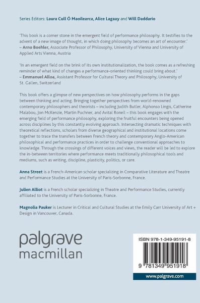This book offers a glimpse of new perspectives on how philosophy performs in the gaps between thinking and acting. Bringing together perspectives from world-renowned contemporary philosophers and theorists - including Judith Butler, Alphonso Lingis, Catherine Malabou, Jon McKenzie, Martin Puchner, and Avital Ronell - this book engages with the emerging field of performance philosophy, exploring the fruitful encounters being opened across disciplines by this constantly evolving approach. Intersecting dramatic techniques with theoretical reflections, scholars from diverse geographical and institutional locations come together to trace the transfers between French theory and contemporary Anglo-American philosophical and performance practices in order to challenge conventional approaches to knowledge. Through the crossings of different voices and views, the reader will be led to explore the in-between territories where performance meets traditionally philosophical tools and mediums, such as writing, discipline, plasticity, politics, or care.