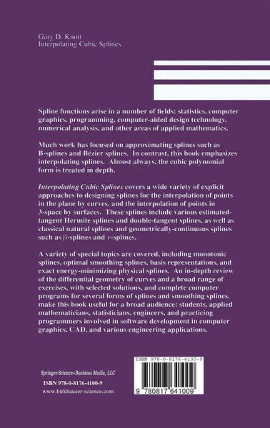 "Spline functions arise in a number of fields: statistics, computer graphics, programming, computer-aided design technology, numerical analysis, and other areas of applied mathematics. Much work has focused on approximating splines such as B-splines and Bezier splines. In contrast, this book emphasizes interpolating splines. Almost always, the cubic polynomial form is treated in depth. Interpolating Cubic Splines covers a wide variety of explicit approaches to designing splines for the interpolation of points in the plane by curves, and the interpolation of points in 3-space by surfaces. These splines include various estimated-tangent Hermite splines and double-tangent splines, as well as classical natural splines and geometrically-continuous splines such as beta-splines and n-splines. . . A variety of special topics are covered, including monotonic splines, optimal smoothing splines, basis representations, and exact energy-minimizing physical splines. An in-depth review of the differential geometry of curves and a broad range of exercises, with selected solutions, and complete computer programs for several forms of splines and smoothing splines, make this book useful for a broad audience: students, applied mathematicians, statisticians, engineers, and practicing programmers involved in software development in computer graphics, CAD, and various engineering applications." --Zentralblatt Math
