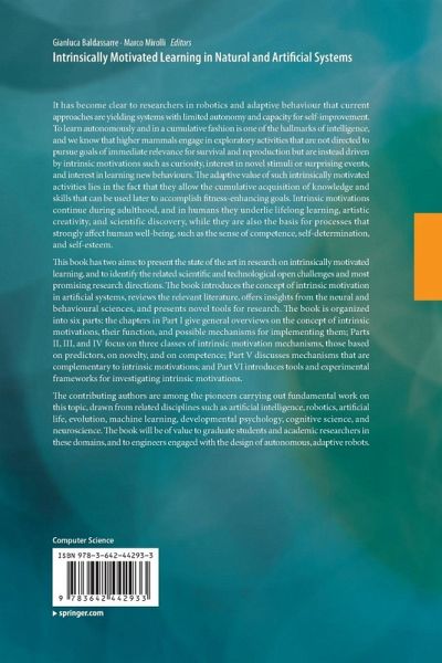 This book has two aims: to present the state of the art in research on intrinsically motivated learning, and to identify the related scientific and technological open challenges and most promising research directions. The book introduces the concept of intrinsic motivation in artificial systems, reviews the relevant literature, offers insights from the neural and behavioural sciences, and presents novel tools for research. The book is organized into six parts: the chapters in Part I give general overviews on the concept of intrinsic motivations, their function, and possible mechanisms for implementing them; Parts II, III, and IV focus on three classes of intrinsic motivation mechanisms, those based on predictors, on novelty, and on competence; Part V discusses mechanisms that are complementary to intrinsic motivations; and Part VI introduces tools and experimentalframeworks for investigating intrinsic motivations.