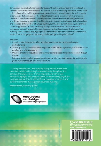 Semantics is the study of meaning in language. This clear and comprehensive textbook provides an introduction to the subject for undergraduate students. It not only equips students with the concepts they need in order to understand the main aspects of semantics, it also introduces the styles of reasoning and argument which characterise the field. It contains more than 200 exercises and discussion questions designed to test and deepen readers' understanding. More inclusive than other textbooks, it clearly explains and contrasts different theoretical approaches, summarises current debates, and provides helpful suggestions for further reading. Examples are drawn both from major world languages, such as Mandarin Chinese, Japanese, Arabic, Spanish and English, and from minority ones. The book also highlights the connections between semantics and the wider study of human language in psychology, anthropology, and linguistics itself.