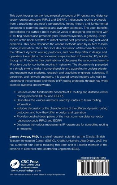 This book focuses on the fundamental concepts of IP routing and distance-vector routing protocols (RIPv2 and EIGRP). It discusses routing protocols from a practicing engineer's perspective, linking theory and fundamental concepts to common practices and everyday examples. The book benefits and reflects the author's more than 22 years of designing and working with IP routing devices and protocols (and Telecoms systems, in general). Every aspect of the book is written to reflect current best practices using real-world examples. This book describes the various methods used by routers to learn routing information. The author includes discussion of the characteristics of the different dynamic routing protocols, and how they differ in design and operation. He explains the processing steps involved in forwarding IP packets through an IP router to their destination and discusses the various mechanisms IP routers use for controlling routing in networks. The discussion is presented in a simple style to make it comprehensible and appealing to undergraduate and graduate level students, research and practicing engineers, scientists, IT personnel, and network engineers. It is geared toward readers who want to understand the concepts and theory of IP routing protocols, through real-world example systems and networks. Focuses on the fundamental concepts of IP routing and distance-vector routing protocols (RIPv2 and EIGRP). Describes the various methods used by routers to learn routing information. Includes discussion of the characteristics of the different dynamic routing protocols, and how they differ in design and operation. Provides detailed descriptions of the most common distance-vector routing protocols RIPv2 and EIGRP. Discusses the various mechanisms IP routers use for controlling routing in networks. James Aweya, PhD, is a chief research scientist at the Etisalat British Telecom Innovation Center (EBTIC), Khalifa University, Abu Dhabi, UAE. He has authored four books including this book and is a senior member of the Institute of Electrical and Electronics Engineers (IEEE).