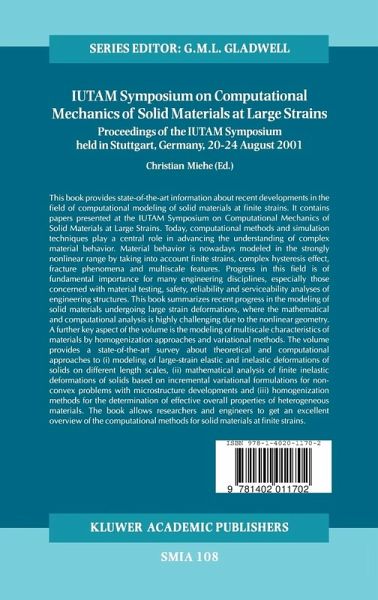 The steady increase in computational power induces an equally steady increase in the complexity of the engineering models and associated computer codes. This particularly affects the modeling of the mechanical response of materials. Material behavior is nowadays modeled in the strongly nonlinear range by tak ing into account finite strains, complex hysteresis effects, fracture phenomena and multiscale features. Progress in this field is of fundamental importance for many engineering disciplines, especially those concerned with material testing, safety, reliability and serviceability analyses of engineering structures. In recent years many important achievements have been made in the field of the theoretical formulation, the mathematical analysis and the numerical im plementation of deformation processes in solids. Computational methods and simulation techniques today play a central role in advancing the understanding of complex material behavior. Research in the field of "ComputationalMechan ics of Materials" is concerned with the development of mathematical models and numerical solution techniques for the simulation of material response. It is a very broad interdisciplinary field of science with inputs from traditional fields such as Applied Mechanics, Applied Mathematics, Materials Science, Solid State Physics and Information Technology. The intention of the IUTAM Symposium "Computational Mechanics of Solid Materials at Large Strains", held at the University of Stuttgart, Germany, from August 20-24, 200I, was to give a state of the art and a survey about recent developments in this field and to create perspectives for future research trends.