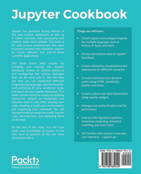 Leseprobe öffnen Dan ToomeyBroschiertes BuchJupyter Cookbook Versandkostenfrei!Versandfertig in 1-2 Wochen41,99 €inkl. MwSt. Jetzt bewerten In den WarenkorbWeitere Ausgaben: eBook, ePUB PAYBACK Punkte 21 °P sammeln! BeschreibungBewertungProduktdetails Jupyter Cookbook ProduktdetailsVerlag: Packt PublishingSeitenzahl: 238Erscheinungstermin: 28. April 2018 EnglischAbmessung: 235mm x 191mm x 14mmGewicht: 453gISBN-13: 9781788839440ISBN-10: 1788839447Artikelnr.: 52530264HerstellerkennzeichnungLibri GmbHEuropaallee 136244 Bad Hersfeldgpsr@libri.de Für dieses Produkt wurde noch keine Bewertung abgegeben. Wir würden uns sehr freuen, wenn du die erste Bewertung schreibst! Eine Bewertung schreiben Andere Kunden interessierten sich für Cyrille Rossant IPython Interactive Computing and … 40,99 € Dan Toomey Learning Jupyter 5, Second Edition 42,99 € Dan Toomey Jupyter for Data Science 40,99 € Alex Galea Applied Data Science with Python and … 32,99 € Marc Wintjen Practical Data Analysis using Jupyter … 38,99 € Alex Galea Beginning Data Analysis with Python And … 19,99 € Robert Hedblom Microsoft System Center Data Protection … 62,99 € Raúl Estrada Apache Kafka 1.0 Cookbook 38,99 € Greg Deckler, Brett … Microsoft Power BI Cookbook - Second … 70,99 € William Ayd, Matthew … Pandas Cookbook - Third Edition 50,99 €