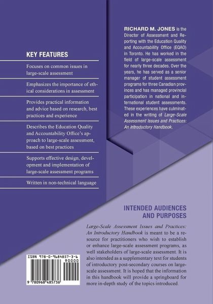 Large-Scale Assessment Issues and Practices: An Introductory Handbook focuses on common issues in large-scale assessment; emphasizes the importance of ethical considerations in assessment; provides practical information and advice based on research, best practices and experience; describes the Education Quality and Accountability Office's (EQAO) approach to large-scale assessment; supports effective design, development and implementation of large-scale assessment programs; and is written in non-technical language. The handbook is meant to be a resource for practitioners who wish to establish or enhance large-scale assessment programs, as well as stakeholders of large-scale assessment. It is also intended as a supplementary text for students of introductory post-secondary courses on large-scale assessment.