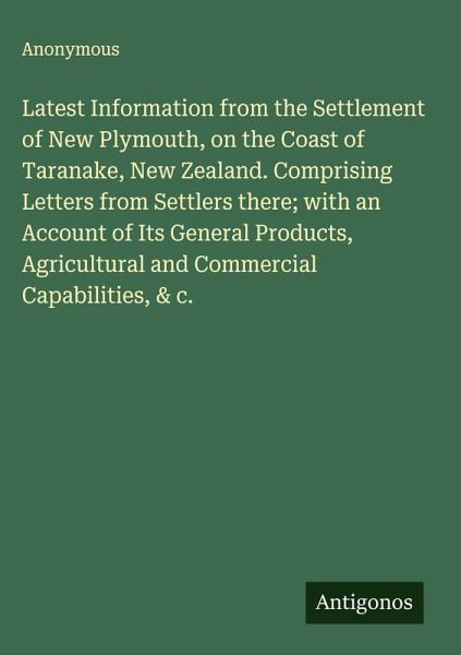 Latest Information from the Settlement of New Plymouth, on the Coast of Taranake, New Zealand. Comprising Letters from Settlers there; with an Account of Its General Products, Agricultural and Commercial Capabilities, & c.