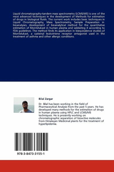 Liquid chromatography-tandem mass spectrometry (LCMS/MS) is one of the most advanced techniques in the development of Methods for estimation of drugs in biological fluids. The current work includes basic techniques in Liquid Chromatography, Mass Spectrometry, Sample Preparation in bioanalyses, development of bioanalytical method for the quantitative estimation of Montelukast in human plasma and validating it according to FDA guidelines. The method finds its application in biequivalence studies of Montelukast, a cysteinyl leukotriene receptor antagonist used in the treatment of asthma and other...