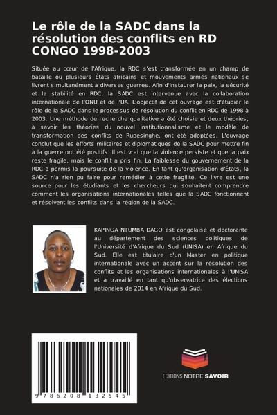Située au coeur de l'Afrique, la RDC s'est transformée en un champ de bataille où plusieurs États africains et mouvements armés nationaux se livrent simultanément à diverses guerres. Afin d'instaurer la paix, la sécurité et la stabilité en RDC, la SADC est intervenue avec la collaboration internationale de l'ONU et de l'UA. L'objectif de cet ouvrage est d'étudier le rôle de la SADC dans le processus de résolution du conflit en RDC de 1998 à 2003. Une méthode de recherche qualitative a été choisie et deux théories, à savoir les théories du nouvel institutionnalisme et le modèle de transformation des conflits de Rupesinghe, ont été adoptées. L'ouvrage conclut que les efforts militaires et diplomatiques de la SADC pour mettre fin à la guerre ont été positifs. Il est vrai que la violence persiste et que la paix reste fragile, mais le conflit a pris fin. La faiblesse du gouvernement de la RDC a permis la poursuite de la violence. En tant qu'organisation d'États, la SADC n'a rien pu faire pour remédier à cette fragilité. Ce livre est une source pour les étudiants et les chercheurs qui souhaitent comprendre comment les organisations internationales telles que la SADC fonctionnent et résolvent les conflits dans la région de la SADC.