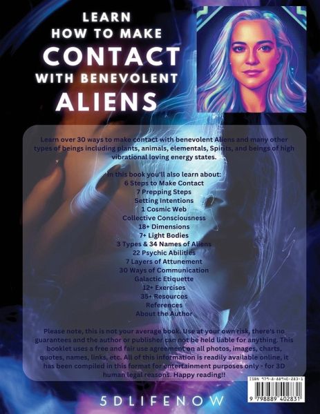Learn over 30 ways to make contact with benevolent Aliens and many other types of beings including plants, animals, elementals, Spirits, and beings of high vibrational loving energy states. In this book you'll also learn about:6 Steps to Make Contact 7 Prepping Steps Setting Intentions 1 Cosmic Web Collective Consciousness 18+ Dimensions 7+ Light Bodies 3 Types & 34 Names of Aliens 22 Psychic Abilities 7 Layers of Attunement 30 Ways of Communication Galactic Etiquette 12+ Exercises 35+ Resources References About the Author Please note, this is not your average book. Use at your own risk, there's no guarantees and the author or publisher can not be held liable for anything. This booklet uses a free and fair use agreement on all photos, images, charts, quotes, names, links, etc. All of this information is readily available online, it has been compiled in this format for entertainment purposes only - for 3D human legal reasons. Happy reading!!