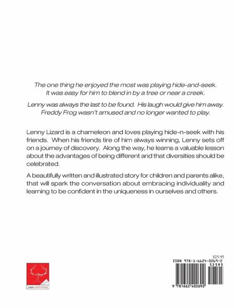 The one thing he enjoyed the most was playing hide-and-seek. It was easy for him to blend in by a tree or near a creek. Lenny was always the last to be found. His laugh would give him away. Freddy Frog wasn't amused and no longer wanted to play. Lenny Lizard is a chameleon and loves playing hide-n-seek with his friends. When his friends tire of him always winning, Lenny sets off on a journey of discovery. Along the way, he learns a valuable lesson about the advantages of being different and that diversities should be celebrated. A beautifully written and illustrated story for children and parents alike, that will spark the conversation about embracing individuality and learning to be confident in the uniqueness in ourselves and others.