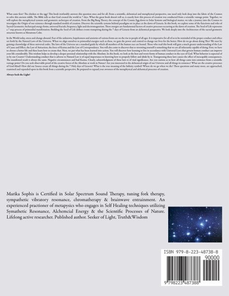 What came first? The chicken or the egg? This book irrefutably answers this question once and for all. From a scientific, alchemical and metaphysical perspective, one need only look deep into the fabric of the Cosmos to solve this ancient riddle. The Bible tells us that God created the world in 7 days. What the great book doesn't tell us, is exactly how this process of creation was conducted from a scientific vantage point. Together, we will explore the metaphysical systems and geometric archetypes of creation. From the Big Bang Theory, the concept of the Cosmic Egg down to Solar Systems and biological matter, we take a journey into the Cosmos to investigate the Origin of our existence through standard models of creation. Discover the scientific systems behind paradigms set in place at the dawn of Genesis. In this book, we explore some of the functions and roles of Sacred Geometric Archetypal energy forms, universal fractals, frequency, light and electromagnetism. These energies are fundamental factors of creative processes occurring at the dawn of creation. The Seed of Life represents a 7 step process of primordial manifestation. Building the Seed of Life defines events transpiring during the 7 days of Genesis from an alchemical perspective. We look deeply into the Architecture of the sacred geometric structure known as Metatrons Cube. In the World today, stress and change abound. Fear of the unknown, hopelessness and anxieties of various forms are on the rise in people of all ages. It is imperative for all of us to be reminded of the proper conduct and ethics set forth by the Natural Laws of the Universe. When we align ourselves to primordial energies such as these, we gain the power and control to change our lives for the better. How do we go about doing This? We start by gaining a knowledge of these universal codes. The laws of the Universe are a standard guide by which all members of the human race are bound. Those who read this book will gain a much greater understanding of the Law of Cause and Effect, the Law of Attraction, the force of Karma and the Law of Correspondence. You will also come to discover that re-inventing yourself is something that we are all inherantly capable of doing. First, we have to choose a better life and then learn how to create that. Next, we put what has been learned into action. You will discover how learning to live in accordance with Universal Laws that govern human conduct can improve your life considerably. This wisdom helps us develop a deeper personal relationship with the Absolute. In this book, we look at the best and worst forms of human conduct in the eyes of God. What behavior is expected of us by our Creator? Understanding conduct that is adverse to Natural Law is of equal importance to knowing how to properly follow and abide by it. Transgressing these laws causes the effect of inescapable consequences. The manifested result is always the same. Negative circumstances and bad Karma. Clearly, acknowledgment of these laws is of vital significance. Are you curious as to how all things came into existence from a scientific vantage point? Do you seek observable proof of the creative forces of the Absolute at work in Nature? Are you interested in the alchemical origin of our Universe and all things in existence? What are the creative processes of God-Mind? How did our Source create all things during the 7 Holy days of Genesis? What is the true meaning of the Infinity symbol? Where do we go when we die? These questions and many more, are approached, examined and expanded upon in this book from a scientific perspective. Be prepared to expand your awareness of the metaphysical and alchemical processes of creation. Always Seek the Light!