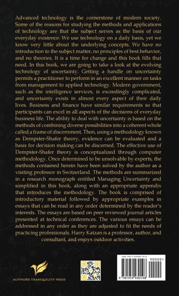 Advanced technology is the cornerstone of modern society. Some of the reasons for studying the methods and applications of technology are that the subject serves as the basis of our everyday existence. We use technology on a daily basis, yet we know very little about the underlying concepts. We have no introduction to the subject matter, no principles of best behavior, and no theories. It is a time for change and this book fills that need. In this book, we are going to take a look at the evolving technology of uncertainty. Getting a handle on uncertainty permits a practitioner to perform in an excellent manner on tasks from management to applied technology. Modern government, such as the intelligence services, is exceedingly complicated, and uncertainty exists in almost every aspect of their daily lives. Business and finance have similar requirements so that participants can excel in all aspects of the decisions of everyday business life. The ability to deal with uncertainty is based on the methods of combining diverse possibilities into a coherent whole called a frame of discernment. Then, using a methodology known as Dempster-Shafer theory, evidence can be evaluated and a basis for decision making can be discerned. The effective use of Dempster-Shafer theory is conceptualized through computer methodology. Once determined to be unsolvable by experts, the methods contained herein have been solved by the author as a visiting professor in Switzerland. The methods are summarized in a research monograph entitled Managing Uncertainty and simplified in this book, along with an appropriate appendix that introduces the methodology. The book is comprised of introductory material followed by appropriate examples in essays that can be read in any order determined by the reader's interests. The essays are based on peer reviewed journal articles presented at technical conferences. The various essays can be addressed in any order as they are adjusted to fit the needs of practicing professionals. Harry Katzan is a professor, author, and consultant, and enjoys outdoor activities.