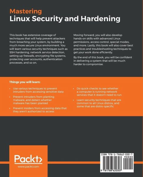 A comprehensive guide to mastering the art of preventing your Linux system from getting compromised. Key Features:Leverage this guide to confidently deliver a system that reduces the risk of being hacked Perform a number of advanced Linux security techniques such as network service detection, user authentication, controlling special permissions, encrypting file systems, and much more Master the art of securing a Linux environment with this end-to-end practical guide Book Description: This book has extensive coverage of techniques that will help prevent attackers from breaching your system, by building a much more secure Linux environment. You will learn various security techniques such as SSH hardening, network service detection, setting up firewalls, encrypting file systems, protecting user accounts, authentication processes, and so on. Moving forward, you will also develop hands-on skills with advanced Linux permissions, access control, special modes, and more. Lastly, this book will also cover best practices and troubleshooting techniques to get your work done efficiently. By the end of this book, you will be confident in delivering a system that will be much harder to compromise. What You Will Learn:Use various techniques to prevent intruders from accessing sensitive data Prevent intruders from planting malware, and detect whether malware has been planted Prevent insiders from accessing data that they aren't authorized to access Do quick checks to see whether a computer is running network services that it doesn't need to run Learn security techniques that are common to all Linux distros, and some that are distro-specific Who this book is for: If you are a systems administrator or a network engineer interested in making your Linux environment more secure, then this book is for you. Security consultants wanting to enhance their Linux security skills will also benefit from this book. Prior knowledge of Linux is mandatory.