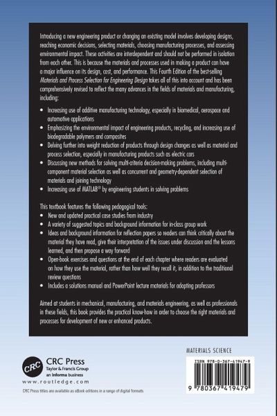 Introducing a new engineering product or changing an existing model involves developing designs, reaching economic decisions, selecting materials, choosing manufacturing processes, and assessing environmental impact. These activities are interdependent and should not be performed in isolation from each other. This is because the materials and processes used in making a product can have a major influence on its design, cost, and performance in service. This Fourth Edition of the best-selling Materials and Process Selection for Engineering Design takes all of this into account and has been comprehensively revised to reflect the many advances in the fields of materials and manufacturing, including: Increasing use of additive manufacturing technology, especially in biomedical, aerospace and automotive applications Emphasizing the environmental impact of engineering products, recycling, and increasing use of biodegradable polymers and composites Analyzing further into weight reduction of products through design changes as well as material and process selection, especially in manufacturing products such as electric cars Discussing new methods for solving multi-criteria decision-making problems, including multi-component material selection as well as concurrent and geometry-dependent selection of materials and joining technology Increasing use of MATLAB by engineering students in solving problems This textbook features the following pedagogical tools: New and updated practical case studies from industry A variety of suggested topics and background information for in-class group work Ideas and background information for reflection papers so readers can think critically about the material they have read, give their interpretation of the issues under discussion and the lessons learned, and then propose a way forward Open-book exercises and questions at the end of each chapter where readers are evaluated on how they use the material, rather than how well they recall it, in addition to the traditional review questions Includes a solutions manual and PowerPoint lecture materials for adopting professors Aimed at students in mechanical, manufacturing, and materials engineering, as well as professionals in these fields, this book provides the practical know-how in order to choose the right materials and processes for development of new or enhanced products.