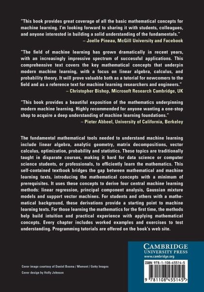 The fundamental mathematical tools needed to understand machine learning include linear algebra, analytic geometry, matrix decompositions, vector calculus, optimization, probability and statistics. These topics are traditionally taught in disparate courses, making it hard for data science or computer science students, or professionals, to efficiently learn the mathematics. This self-contained textbook bridges the gap between mathematical and machine learning texts, introducing the mathematical concepts with a minimum of prerequisites. It uses these concepts to derive four central machine learning methods: linear regression, principal component analysis, Gaussian mixture models and support vector machines. For students and others with a mathematical background, these derivations provide a starting point to machine learning texts. For those learning the mathematics for the first time, the methods help build intuition and practical experience with applying mathematical concepts. Every chapter includes worked examples and exercises to test understanding. Programming tutorials are offered on the book's web site.