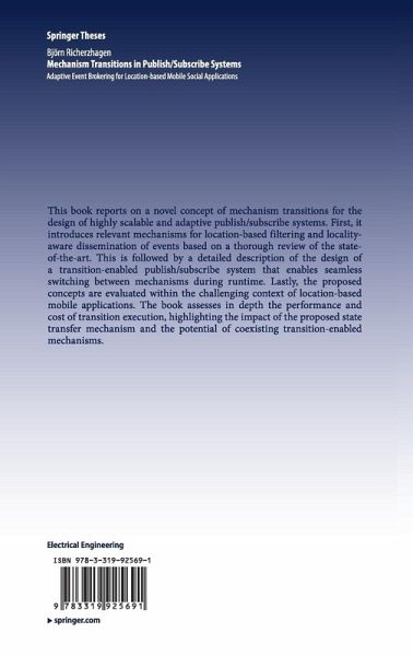 This book reports on a novel concept of mechanism transitions for the design of highly scalable and adaptive publish/subscribe systems. First, it introduces relevant mechanisms for location-based filtering and locality-aware dissemination of events based on a thorough review of the state-of-the-art. This is followed by a detailed description of the design of a transition-enabled publish/subscribe system that enables seamless switching between mechanisms during runtime. Lastly, the proposed concepts are evaluated within the challenging context of location-based mobile applications. The book assesses in depth the performance and cost of transition execution, highlighting the impact of the proposed state transfer mechanism and the potential of coexisting transition-enabled mechanisms.