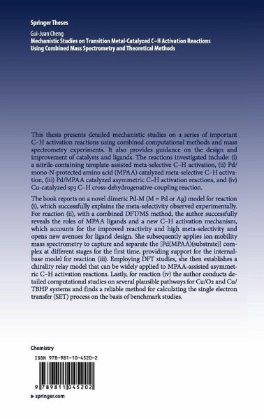 The book reports on a novel dimeric Pd-M (M = Pd or Ag) model for reaction (i), which successfully explains the meta-selectivity observed experimentally. For reaction (ii), with a combined DFT/MS method, the author successfully reveals the roles of MPAA ligands and a new C-H activation mechanism, which accounts for the improved reactivity and high meta-selectivity and opens new avenues for ligand design. She subsequently applies ion-mobility mass spectrometry to capture and separate the [Pd(MPAA)(substrate)] complex at different stages for the first time, providing support for the internal-base model for reaction (iii). Employing DFT studies, she then establishes a chirality relay model that can be widely applied to MPAA-assisted asymmetric C-H activation reactions. Lastly, for reaction (iv) the author conducts detailed computational studies on several plausible pathways for Cu/O2 and Cu/TBHP systems and finds a reliable method for calculating the single electron transfer (SET) process on the basis of benchmark studies.