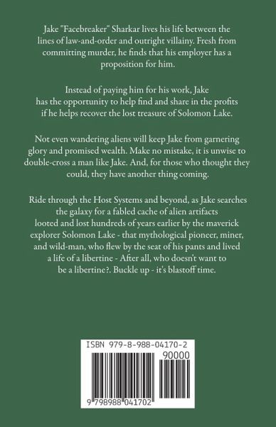 Jake "Facebreaker" Sharkar lives his life between the lines of law-and-order and outright villainy. Fresh from committing murder, he finds that his employer has a proposition for him. Instead of paying him for his work, Jake has the opportunity to help find and share in the profits if he helps recover the lost treasure of Solomon Lake. Not even wandering aliens will keep Jake from garnering glory and promised wealth. Make no mistake, it is unwise to double-cross a man like Jake. And, for those who thought they could, they have another thing coming. Ride through the Host Systems and beyond, as Jake searches the galaxy for a fabled cache of alien artifacts looted and lost hundreds of years earlier by the maverick explorer Solomon Lake - that mythological pioneer, miner, and wild-man, who flew by the seat of his pants and lived a life of a libertine - After all, who doesn't want to be a libertine?. Buckle up - it's blastoff time.