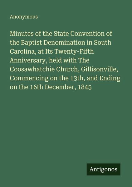 Minutes of the State Convention of the Baptist Denomination in South Carolina, at Its Twenty-Fifth Anniversary, held with The Coosawhatchie Church, Gillisonville, Commencing on the 13th, and Ending on the 16th December, 1845