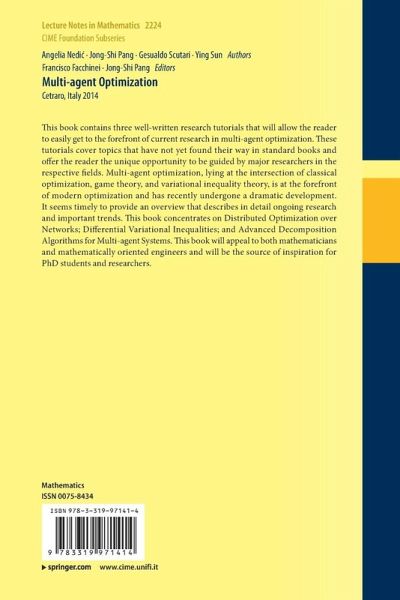 This book contains three well-written research tutorials that inform the graduate reader about the forefront of current research in multi-agent optimization. These tutorials cover topics that have not yet found their way in standard books and offer the reader the unique opportunity to be guided by major researchers in the respective fields. Multi-agent optimization, lying at the intersection of classical optimization, game theory, and variational inequality theory, is at the forefront of modern optimization and has recently undergone a dramatic development. It seems timely to provide an overvi...