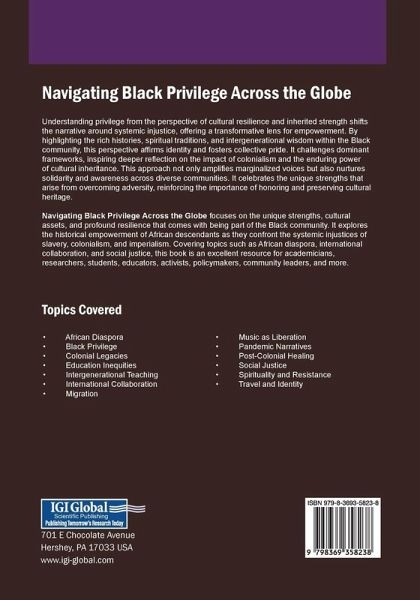 Understanding privilege from the perspective of cultural resilience and inherited strength shifts the narrative around systemic injustice, offering a transformative lens for empowerment. By highlighting the rich histories, spiritual traditions, and intergenerational wisdom within the Black community, this perspective affirms identity and fosters collective pride. It challenges dominant frameworks, inspiring deeper reflection on the impact of colonialism and the enduring power of cultural inheritance. This approach not only amplifies marginalized voices but also nurtures solidarity and awareness across diverse communities. It celebrates the unique strengths that arise from overcoming adversity, reinforcing the importance of honoring and preserving cultural heritage. Navigating Black Privilege Across the Globe focuses on the unique strengths, cultural assets, and profound resilience that comes with being part of the Black community. It explores the historical empowerment of African descendants as they confront the systemic injustices of slavery, colonialism, and imperialism. Covering topics such as African diaspora, international collaboration, and social justice, this book is an excellent resource for academicians, researchers, students, educators, activists, policymakers, community leaders, and more.