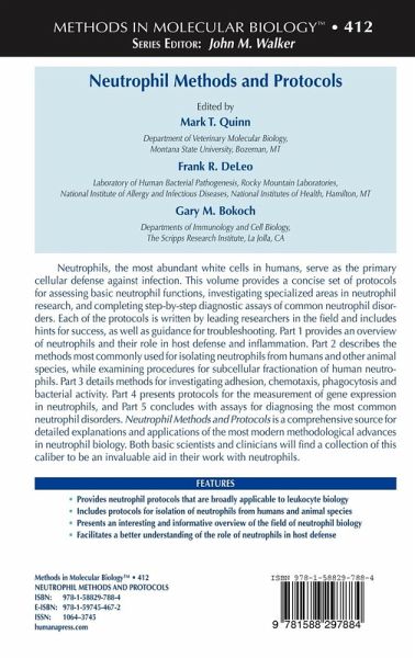 Neutrophil Methods and Protocols provides a concise set of protocols for assessing basic neutrophil functions, investigating specialized areas in neutrophil research, and completing step-by-step diagnostic assays of common neutrophil disorders. Each of the protocols is written by leading researchers in the field and includes hints for success, as well as guidance for troubleshooting. Parts 1 & 2 provide an overview of neutrophils the methods most commonly used for isolating them from humans and other animal species. Part 3 details methods for investigating adhesion, chemotaxis, phagocytosis and bacterial activity. Part 4 presents protocols measuring gene expression in neutrophils, and Part 5 concludes with assays for diagnosing the most common neutrophil disorders. Both basic scientists and clinicians will find a collection of this caliber to be an invaluable aid in their work with neutrophils.