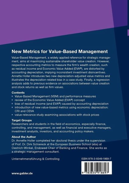 Still today, the vast majority of the German DAX 30 corporations are explicitly com- ted to the shareholder value idea. However, the stock return to shareholders is an inappropriate measure for internal performance management, so that companies revert to so-called Value-Based Management Systems. These systems derive accounti- based performance measures, which shall quantify whether and how much shareholder value has been generated by the management over a specific period (overall and by business unit). Data applied for calculating the performance measure has to be publicly available and, preferably, also separately disclosed, to allow capital market participants to project results of the performance measure on the stock price. Various metrics (net earnings, residual income, EVA, REVA), which also demonstrated some correlation with stock returns in empirical studies, have been implemented for performance measurement in the past, but these measures still show methodological deficits and also the correlation with the stock performance can still be increased considerably. Also in this respect, the study of Annette Holler makes a substantial contribution, demonstrating that two new metrics (CRI, CEVA) show superior results both methodologically and in the empirical test. To date, such an examination of various yet existing and newly developed performance measures has not been known to me. Hence, the dissertation of Ms. Holler extends, in an amazing way, preceding academic research.