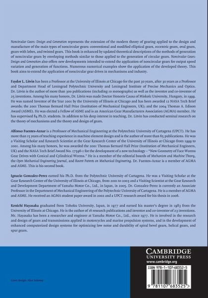 Noncircular Gears: Design and Generation represents the extension of the modern theory of gearing applied to the design and manufacture of the main types of noncircular gears: conventional and modified elliptical gears, eccentric gears, oval gears, gears with lobes, and twisted gears. This book is enhanced by updated theoretical description of the methods of generation of noncircular gears by enveloping methods similar to those applied to the generation of circular gears. Noncircular Gears: Design and Generation also offers new developments directed to extend the application of noncircular gears for output speed variation and generation of functions. Numerous numerical examples show the application of the developed theory. This book aims to extend the application of noncircular gear drives in mechanisms and industry.