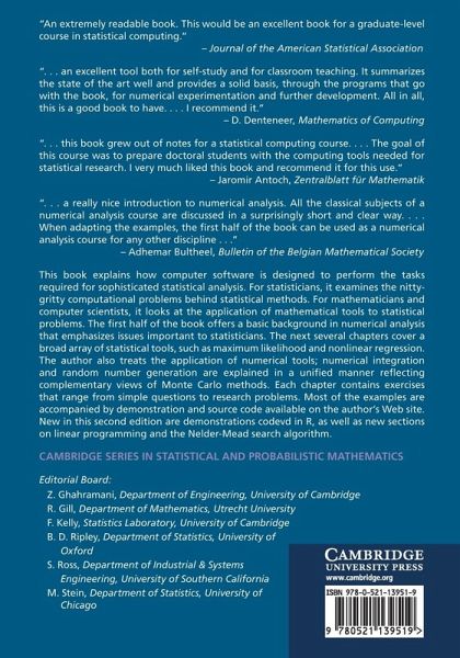 This book explains how computer software is designed to perform the tasks required for sophisticated statistical analysis. For statisticians, it examines the nitty-gritty computational problems behind statistical methods. For mathematicians and computer scientists, it looks at the application of mathematical tools to statistical problems. The first half of the book offers a basic background in numerical analysis that emphasizes issues important to statisticians. The next several chapters cover a broad array of statistical tools, such as maximum likelihood and nonlinear regression. The author also treats the application of numerical tools; numerical integration and random number generation are explained in a unified manner reflecting complementary views of Monte Carlo methods. Each chapter contains exercises that range from simple questions to research problems. Most of the examples are accompanied by demonstration and source code available from the author's website. New in this second edition are demonstrations coded in R, as well as new sections on linear programming and the Nelder-Mead search algorithm.