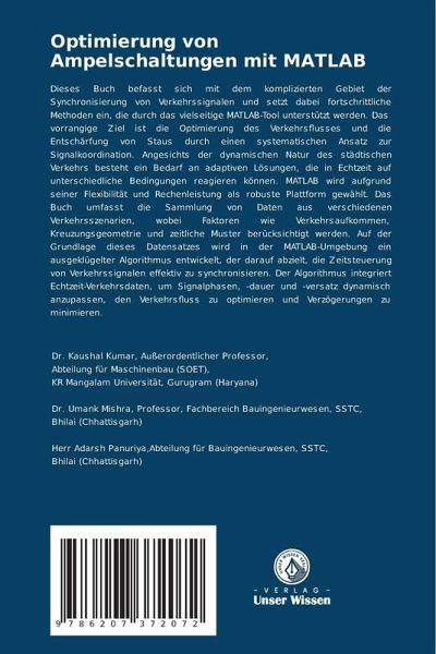 Dieses Buch befasst sich mit dem komplizierten Gebiet der Synchronisierung von Verkehrssignalen und setzt dabei fortschrittliche Methoden ein, die durch das vielseitige MATLAB-Tool unterstützt werden. Das vorrangige Ziel ist die Optimierung des Verkehrsflusses und die Entschärfung von Staus durch einen systematischen Ansatz zur Signalkoordination. Angesichts der dynamischen Natur des städtischen Verkehrs besteht ein Bedarf an adaptiven Lösungen, die in Echtzeit auf unterschiedliche Bedingungen reagieren können. MATLAB wird aufgrund seiner Flexibilität und Rechenleistung als robuste Plattform gewählt. Das Buch umfasst die Sammlung von Daten aus verschiedenen Verkehrsszenarien, wobei Faktoren wie Verkehrsaufkommen, Kreuzungsgeometrie und zeitliche Muster berücksichtigt werden. Auf der Grundlage dieses Datensatzes wird in der MATLAB-Umgebung ein ausgeklügelter Algorithmus entwickelt, der darauf abzielt, die Zeitsteuerung von Verkehrssignalen effektiv zu synchronisieren. Der Algorithmus integriert Echtzeit-Verkehrsdaten, um Signalphasen, -dauer und -versatz dynamisch anzupassen, den Verkehrsfluss zu optimieren und Verzögerungen zu minimieren.
