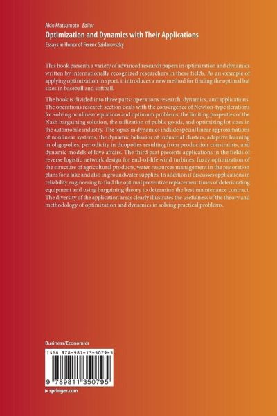The book is divided into three parts: operations research, dynamics, and applications. The operations research section deals with the convergence of Newton-type iterations for solving nonlinear equations and optimum problems, the limiting properties of the Nash bargaining solution, the utilization of public goods, and optimizing lot sizes in the automobile industry. The topics in dynamics include special linear approximations of nonlinear systems, the dynamic behavior of industrial clusters, adaptive learning in oligopolies, periodicity in duopolies resulting from production constraints, and dynamic models of love affairs. The third part presents applications in the fields of reverse logistic network design for end-of-life wind turbines, fuzzy optimization of the structure of agricultural products, water resources management in the restoration plans for a lake and also in groundwater supplies. In addition it discusses applications in reliability engineering to find the optimal preventive replacement times of deteriorating equipment and using bargaining theory to determine the best maintenance contract. The diversity of the application areas clearly illustrates the usefulness of the theory and methodology of optimization and dynamics in solving practical problems.