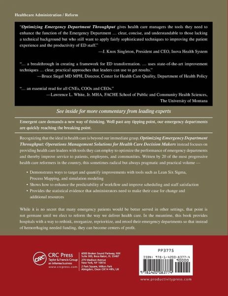 Recognizing that the ideal in health care is presently beyond our immediate grasp, this book instead focuses on providing health care leaders with the tools they can employ to optimize the performance of EDs and thereby improve service to patients, employees, and communities.
