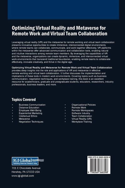 Leveraging virtual reality (VR) and the metaverse for remote working and virtual team collaboration presents innovative opportunities to create immersive, interconnected digital environments where remote teams can collaborate, communicate, and work together effectively. VR platforms within the metaverse offer advanced communication and collaboration tools, enabling natural and intuitive interactions among remote team members. By leveraging the capabilities of VR and the metaverse, organizations can create dynamic, immersive, and interconnected virtual work environments that transcend traditional boundaries, enabling remote teams to collaborate effectively, innovate creatively, and thrive in the digital age. Optimizing Virtual Reality and Metaverse for Remote Work and Virtual Team Collaboration provides deep insights into the role and applications of VR and metaverse in effective remote working and virtual team collaboration. It further discusses the implementation and implications of these tools in modern work environments. Covering topics such as business communication, negotiation techniques, and workplace training, this book is an excellent resource for academicians, graduate and postgraduate students, educators, researchers, industry professionals, business leaders, and more.