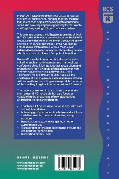 In 2001 AFIHM and the British HCI Group combined their annual conferences, bringing together the best features of each organisation's separate conference series, and providing a special opportunity for the French- and English-speaking HCI communities to interact.This volume contains the full papers presented at IHM-HCI 2001, the 15th annual conference of the British HCI group, a specialist group of the British Computer Society and the 14th annual conference of the Association Francophone d'interaction Homme-Machine, an independent association for any French-speaking person who is interested in...