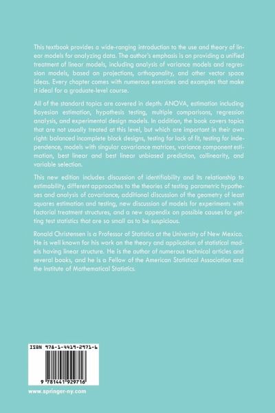 This textbook provides a wide-ranging introduction to the use and theory of linear models for analyzing data. The authors emphasis is on providing a unified treatment of linear models, including analysis of variance models and regression models, based on projections, orthogonality, and other vector space ideas. Every chapter comes with numerous exercises and examples that make it ideal for a graduate- level course. All of the standard topics are covered in depth. In addition, the book covers topics that are not usually treated at this level, but which are important in their own right. The author, Ronald Christensen, is a Professor of Statistics at the University of New Mexico.