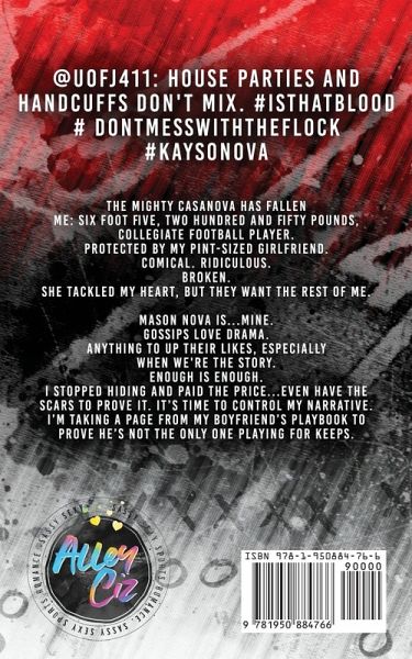 @UofJ411: House parties and handcuffs don't mix. # IsThatBlood # DontMessWithTheFlock # Kaysonova The mighty Casanova has fallenMe: six foot five, two hundred and fifty pounds, collegiate football player. Protected by my pint-sized girlfriend. Comical. Ridiculous. BROKEN. She tackled my heart, but they want the rest of me. Mason Nova is...MINE. Gossips love drama. Anything to up their likes, especially when we're the story. Enough is ENOUGH. I stopped hiding and paid the price...even have the scars to prove it. It's time to control my narrative. I'm taking a page from my boyfriend's playbook t...
