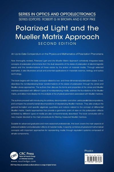 An Up-to-Date Compendium on the Physics and Mathematics of Polarization Phenomena Now thoroughly revised, Polarized Light and the Mueller Matrix Approach cohesively integrates basic concepts of polarization phenomena from the dual viewpoints of the states of polarization of electromagnetic waves and the transformations of these states by the action of material media. Through selected examples, it also illustrates actual and potential applications in materials science, biology, and optics technology. The book begins with the basic concepts related to two- and three-dimensional polarization states. It next describes the nondepolarizing linear transformations of the states of polarization through the Jones and Mueller-Jones approaches. The authors then discuss the forms and properties of the Jones and Mueller matrices associated with different types of nondepolarizing media, address the foundations of the Mueller matrix, and delve more deeply into the analysis of the physical parameters associated with Mueller matrices. The authors proceed with introducing the arbitrary decomposition and other useful parallel decompositions, and compare the powerful serial decompositions of depolarizing Mueller matrices. They also analyze the general formalism and specific algebraic quantities and notions related to the concept of differential Mueller matrix. Useful approaches that provide a geometric point of view on the polarization effects exhibited by different types of media are also comprehensively described. The book concludes with a new chapter devoted to the main procedures for filtering measured Mueller matrices. Suitable for advanced graduates and more seasoned professionals, this book covers the main aspects of polarized radiation and polarization effects of material media. It expertly combines physical and mathematical concepts with important approaches for representing media through equivalent systems composed of simple components.