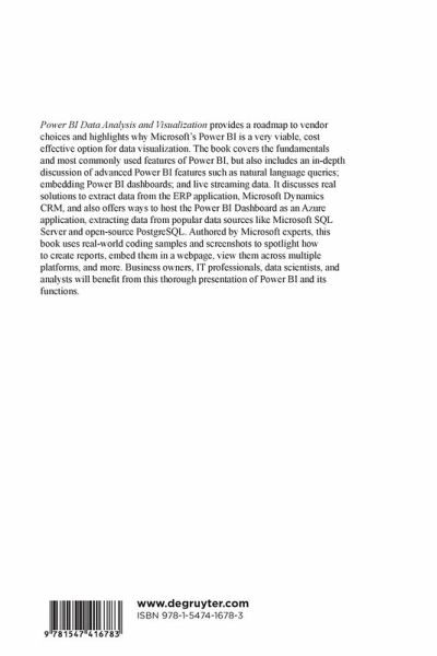 Power BI Data Analysis and Visualization provides a roadmap to vendor choices and highlights why Microsoft's Power BI is a very viable, cost effective option for data visualization. The book covers the fundamentals and most commonly used features of Power BI, but also includes an in-depth discussion of advanced Power BI features such as natural language queries; embedding Power BI dashboards; and live streaming data. It discusses real solutions to extract data from the ERP application, Microsoft Dynamics CRM, and also offers ways to host the Power BI Dashboard as an Azure application, extracting data from popular data sources like Microsoft SQL Server and open-source PostgreSQL.