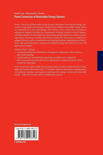 Power Conversion of Renewable Energy Systems presents an introduction to conventional energy conversion components and systems, as well as those related to renewable energy. This volume introduces systems first, and then in subsequent chapters describes the components of energy systems in detail. Readers will find examples of renewable and conventional energy and power systems, including energy conversion, variable-speed drives and power electronics, in addition to magnetic devices such as transformers and rotating machines. Applications of PSpice, MATLAB, and Mathematica are also included, along with solutions to over 100 application examples.