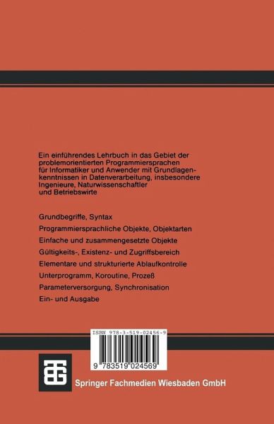 Am Anfang der Entwicklung problemorientierter Programmierspra chen stand der Wunsch nach einer bequemen Formulierung der Ma schinengegebenheiten. FORTRAN II ist ein typischer Vertreter dieser Zeit. Dann wurde die Bedeutung der Strukturierung erkannt: ALGOL 60 legt Wert auf die der Algorithmen, COBOL auf die der Daten. Mehrere Hundert Programmiersprachen entstanden aus und neben diesen Klassikern. Lange Zeit hat es so ausgesehen, als ob ein Programmierer (zur Vereinfachung bezeichne dieser Terminus hier jeden, der mit Pro grammiersprachen zu tun hat) nicht umlernen muB. In festgefUgten Umgebung...