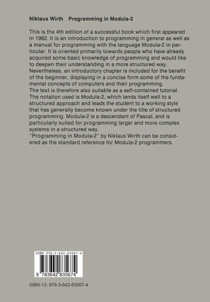 This text is an introduction to programming in general, and a manual for programming with the language Modula-2 in particular. It is oriented primarily towards people who have already acquired some basic knowledge of programming and would like to deepen their understanding in a more structured way. Neveltheless, an introductory chapter is included for the benefit of the beginner, displaying in a concise form some of the fundamental concepts of computers and their programming. The text is therefore also suitable as a self-contained tutorial. The notation used is Modula-2, which lends itself well for a structured approach and leads the student to a working style that has generally become known under the title of structured programming. As a manual for programming in Modula-2, the text covers practically all facilities of that language. Part 1 covers the basic notions of the variable, expression, assignment, conditional and repetitive statement, and array data structure. Together with Palt 2 which introduces the important concept of the procedure or subroutine, it contains essentially the material commonly discussed in introductory programming courses. Part 3 concerns data types and structures and constitutes the essence of an advanced course on programming. Palt 4 introduces the notion of the module, a concept that is fundamental to the design of larger programmed systems and to programming as team work. The most commonly used utility programs for input and output are presented as examples of modules.