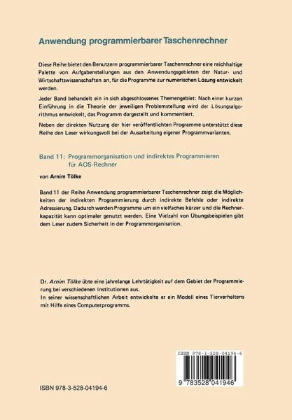 Arnim TölkeBroschiertes BuchProgrammorganisation und indirektes Programmieren für AOS-Rechner Versandkostenfrei!Versandfertig in 1-2 Wochen54,99 €inkl. MwSt. Jetzt bewerten In den WarenkorbWeitere Ausgaben: eBook, PDF PAYBACK Punkte 0 °P sammeln! BeschreibungBewertungProduktdetails Programmorganisation und indirektes Programmieren für AOS-Rechner Produktdetails Anwendung programmierbarer TaschenrechnerVerlag: Vieweg+Teubner / Vieweg+Teubner VerlagArtikelnr. des Verlages: 978-3-528-04194-6 1982Seitenzahl: 124Erscheinungstermin: 1. Januar 1982 DeutschAbmessung: 244mm x 170mm x 8mmGewicht: 240gISBN-13: 9783528041946ISBN-10: 3528041943Artikelnr.: 27146444HerstellerkennzeichnungVieweg+Teubner VerlagAbraham-Lincoln-Straße 4665189 WiesbadenProductSafety@springernature.com Für dieses Produkt wurde noch keine Bewertung abgegeben. Wir würden uns sehr freuen, wenn du die erste Bewertung schreibst! Eine Bewertung schreiben Andere Kunden interessierten sich für Prolog 54,99 € Harald Schumny BASIC und Pascal im Vergleich 54,99 € Ekbert Hering Das Vieweg Buch zu Turbo Pascal für … 54,99 € Berthold Schuppar Logo-Programmierkurs für Commodore 64 … 54,99 € Georg Fischer DOS Profi Utilities mit Turbo Pascal 49,95 € Hansrobert Kohler FORTRAN-Trainer 54,99 € Silvia Gutschmidt dBASE IV Lernen am Konkreten Beispiel 54,99 € C. K. McCabe Programmieren mit FORTH 74,99 € Günter Martin, … Programmieren mit UNIX 54,99 € Kurt Hain Getriebetechnik Kinematik für AOS- und … 54,99 €