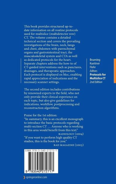 This book provides structured up-to-date information on all routine protocols used for multislice (multidetector row) CT. The volume contains a detailed technical section and covers the prevailing investigations of the brain, neck, lungs and chest, abdomen with parenchymal organs and gastrointestinal tract, the musculoskeletal system and CTA as well as dedicated protocols for the heart. Separate chapters address the how-to of CT-guided interventions such as punctures, drainages, and therapeutic approaches. Each protocol is displayed en bloc, enabling rapid appreciation of indications and the necessary scanner settings.