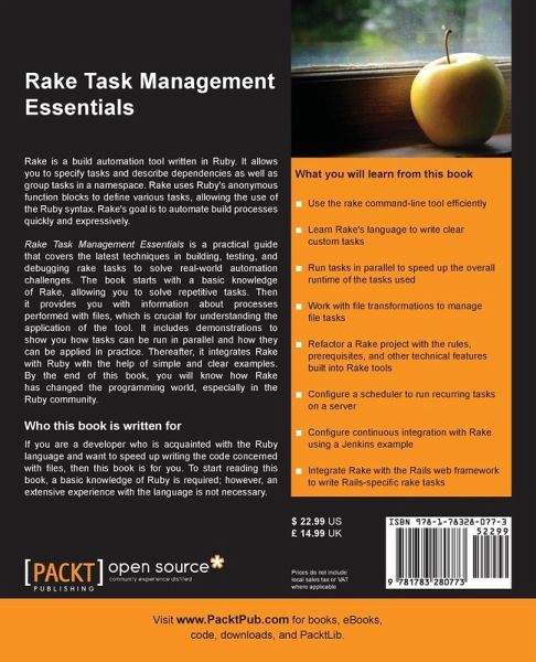 Leseprobe öffnen Andrey KoleshkoBroschiertes BuchRake Task Management Essentials Versandkostenfrei!Versandfertig in 1-2 Wochen25,99 €inkl. MwSt. Jetzt bewerten In den WarenkorbWeitere Ausgaben: eBook, PDF PAYBACK Punkte 13 °P sammeln! BeschreibungBewertungProduktdetails Rake Task Management Essentials ProduktdetailsVerlag: Packt PublishingSeitenzahl: 122Erscheinungstermin: 24. April 2014 EnglischAbmessung: 235mm x 191mm x 8mmGewicht: 244gISBN-13: 9781783280773ISBN-10: 1783280778Artikelnr.: 40782076HerstellerkennzeichnungLibri GmbHEuropaallee 136244 Bad Hersfeldgpsr@libri.de Für dieses Produkt wurde noch keine Bewertung abgegeben. Wir würden uns sehr freuen, wenn du die erste Bewertung schreibst! Eine Bewertung schreiben Andere Kunden interessierten sich für Michael Inden Java Challenges 49,99 € Michael Inden Python Challenges 47,99 € Michael McCool, … Structured Parallel Programming 44,99 € Matthieu Riou Raven 28,99 € David Berube Practical Ruby Gems 26,99 € Matt Cumberlidge Business Process Management with Jboss … 51,99 € Savitra Sirohi, Amit … Koha 3 Library Management System 46,99 € Mohit Raj Python Penetration Testing Essentials 32,99 € Paul Crickard Leaflet.Js Essentials 32,99 € Fernando J Miguel Magento 2 Development Essentials 32,99 €