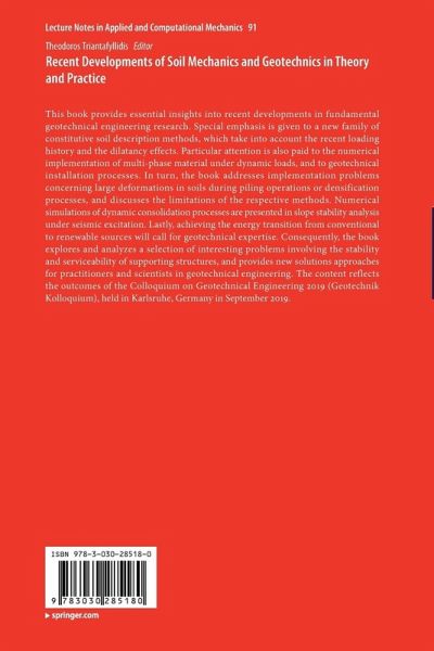 This book provides essential insights into recent developments in fundamental geotechnical engineering research. Special emphasis is given to a new family of constitutive soil description methods, which take into account the recent loading history and the dilatancy effects. Particular attention is also paid to the numerical implementation of multi-phase material under dynamic loads, and to geotechnical installation processes. In turn, the book addresses implementation problems concerning large deformations in soils during piling operations or densification processes, and discusses the limitations of the respective methods. Numerical simulations of dynamic consolidation processes are presented in slope stability analysis under seismic excitation. Lastly, achieving the energy transition from conventional to renewable sources will call for geotechnical expertise. Consequently, the book explores and analyzes a selection of interesting problems involving the stability and serviceability ofsupporting structures, and provides new solutions approaches for practitioners and scientists in geotechnical engineering. The content reflects the outcomes of the Colloquium on Geotechnical Engineering 2019 (Geotechnik Kolloquium), held in Karlsruhe, Germany in September 2019.