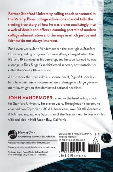 The former Stanford University sailing coach sentenced in the Varsity Blues college admissions scandal tells the riveting true story of how he was drawn unwittingly into a web of deceit in this eye-opening memoir that offers a damning portrait of modern college administration and the ways in which justice and fairness do not always intersect. For eleven years, John Vandemoer ran the prestigious Stanford University sailing program in which he coached Olympians and All-Americans. Though the hours were long and the program struggled for funding, sailing gave Vandemoer’s life shape and meaning. But early one morning, everything came crashing down when Vandemoer, still in his pajamas, opened the door to find FBI and IRS agents on his doorstep. He quickly learned that a recruiter named Rick Singer had used him as a stooge in a sophisticated scheme designed to take advantage of college coaches and play to the endless appetite for university fundraising—and wealthy parents looking for an edge for their college-bound children. Vandemoer was summarily fired, kicked out of campus housing, his children booted from campus daycare. The next year of his life was a Kafkaesque hellscape, and though he was an innocent man who never received a dime was the first person to be convicted in what became known as the Varsity Blues scandal. A true story that reads like a suspense novel, Rigged Justice lays bare how a sophisticated scheme could take advantage of college coaches and university money—and how one family became collateral damage in a large government investigation that dominated national headlines.