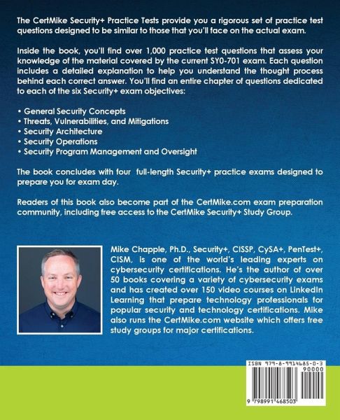 The most complete set of SY0-701 Security+ practice test questions available. The CertMike Security+ Practice Tests provide you a rigorous set of over 1,000 practice test questionsdesigned to be similar to those that you'll face on the actual exam. Inside the book, you'll find over 1,000 practice test questions that assess your knowledge of the material covered by the new SY0-701 exam, released in late 2023. Each question includes a detailed explanation to help you understand the thought process behind each correct answer. You'll find an entire chapter of questions dedicated to each of the five Security+¿ exam objectives: General Security Concepts Threats, Vulnerabilities, and Mitigations Security Architecture Security Operations Security Program Management and Oversight The book concludes with four full-length Security+ practice exams designed to prepare you for exam day. You'll also find examples and advice on answering the performance-based questions (PBQs) that appear on the real exam. Readers of this book also become part of the CertMike.com exam preparation community, including free access to the CertMike Security+ Study Group.