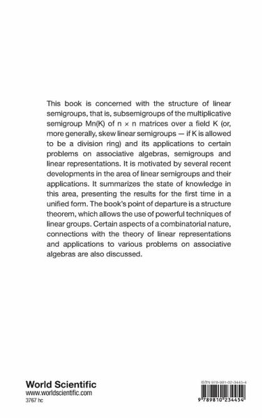 This book is concerned with the structure of linear semigroups, that is, subsemigroups of the multiplicative semigroup Mn(K) of n × n matrices over a field K (or, more generally, skew linear semigroups - if K is allowed to be a division ring) and its applications to certain problems on associative algebras, semigroups and linear representations. It is motivated by several recent developments in the area of linear semigroups and their applications. It summarizes the state of knowledge in this area, presenting the results for the first time in a unified form. The book's point of departure is a structure theorem, which allows the use of powerful techniques of linear groups. Certain aspects of a combinatorial nature, connections with the theory of linear representations and applications to various problems on associative algebras are also discussed.