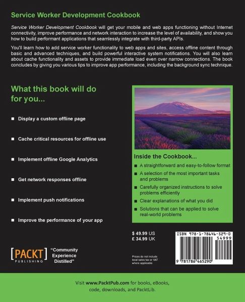 Leseprobe öffnen Sean AmarasingheBroschiertes BuchService Worker Development Cookbook Versandkostenfrei!Versandfertig in 1-2 Wochen53,99 €inkl. MwSt. Jetzt bewerten In den WarenkorbWeitere Ausgaben: eBook, PDF PAYBACK Punkte 27 °P sammeln! BeschreibungBewertungProduktdetails Service Worker Development Cookbook ProduktdetailsVerlag: Packt PublishingSeitenzahl: 384Erscheinungstermin: 31. August 2016 EnglischAbmessung: 235mm x 191mm x 21mmGewicht: 715gISBN-13: 9781786465290ISBN-10: 1786465299Artikelnr.: 47805387HerstellerkennzeichnungLibri GmbHEuropaallee 136244 Bad Hersfeldgpsr@libri.de Für dieses Produkt wurde noch keine Bewertung abgegeben. Wir würden uns sehr freuen, wenn du die erste Bewertung schreibst! Eine Bewertung schreiben Andere Kunden interessierten sich für Jason Kneen Appcelerator Titanium Smartphone App … 47,99 € Isaac Strack Meteor Web Application Development … 43,99 € Jung W. Suh, … Accelerating MATLAB with GPU Computing 45,99 € Gaurav Saini Hybrid Mobile Development with Ionic 42,99 € Mike Hatfield CoffeeScript Application Development … 53,99 € Jay Johnston Mootools 1.3 Cookbook 47,99 € Simon Holmes Mongoose for Application Development 42,99 € Paul Wellens Practical Web Development 47,99 € Ray Rischpater JavaScript JSON Cookbook 47,99 € Rodrigo Silveira Multiplayer Game Development with HTML5 32,99 €