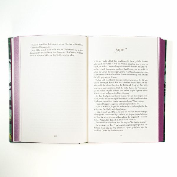 Das Cover von Sol gefällt mir sehr gut. Ich mag die grünen Farben und die Abbildung des Vogels. Der lila Farbschnitt ist ebenfalls wunderschön und lässt die Farben des Covers noch einmal deutlich mehr aufleben.